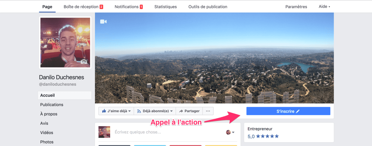 Dans cet article, je ne veux pas rentrer dans les détails, mais simplement vous montrer comment choisir une bonne photo de couverture et le bon bouton d’appel à l’action pour votre Page.
